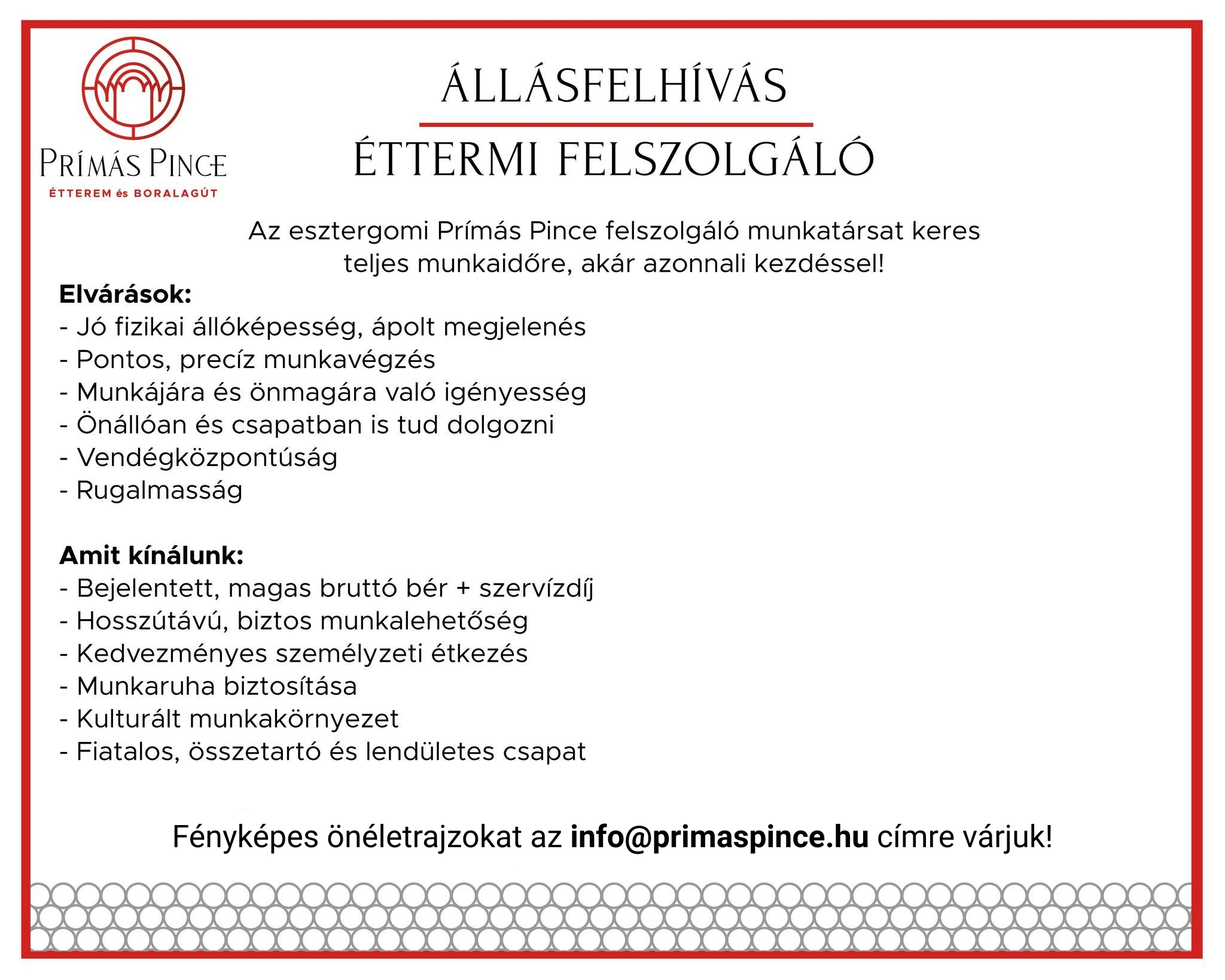 Bejelentett munkaviszony, hosszútávú munkalehetőség, összetartó, lendületes csapat, gyönyörű munkakörnyezet Esztergom szívében!